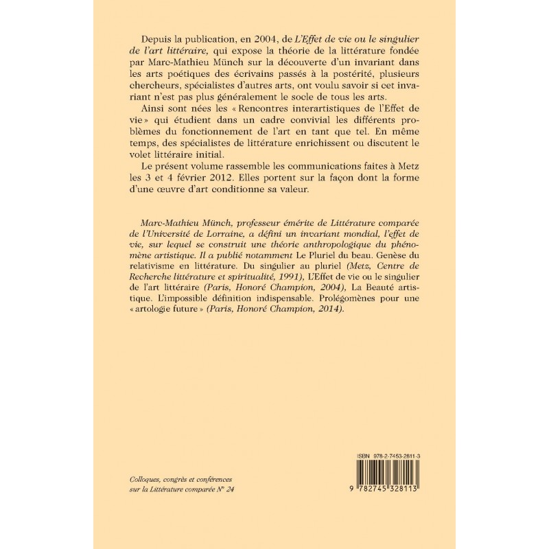 Depuis la publication, en 2004, de L’Effet de vie ou le singulier de l’art littéraire, qui expose la théorie de la littérature fondée par Marc-Mathieu Münch sur la découverte d’un invariant dans les arts poétiques des écrivains passés à la postérité, plusieurs chercheurs, spécialistes d’autres arts, ont voulu savoir si cet invariant n’est pas plus généralement le socle de tous les arts. Ainsi sont nées les « Rencontres interartistiques de l’Effet de vie » qui étudient dans un cadre convivial les différents problèmes du fonctionnement de l’art en tant que tel. En même temps, des spécialistes de littérature enrichissent ou discutent le volet littéraire initial. Le présent volume rassemble les communications faites à Metz les 3 et 4 février 2012. Elles portent sur la façon dont la forme d’une œuvre d’art conditionne sa valeur.