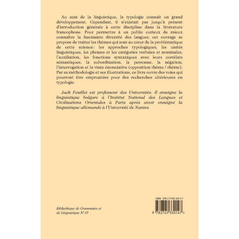 Au sein de la linguistique, la typologie connaît un grand développement. Cependant, il n’existait pas jusqu’à présent d’introduction générale à cette discipline dans la littérature francophone. Pour permettre à un public curieux de mieux connaître la fascinante diversité des langues, cet ouvrage se propose de traiter les thèmes qui sont au cœur de la problématique de cette science: les approches typologiques, les unités linguistiques, les phrases et les catégories verbales et nominales, l’auxiliation, les fonctions syntaxiques avec leurs corrélats sémantiques, la subordination, la personne, la négation, l’interrogation et la visée énonciative (opposition thème / rhème). Par sa méthodologie et ses illustrations, ce livre ouvre des voies qui pourront être empruntées pour des recherches ultérieures en typologie.