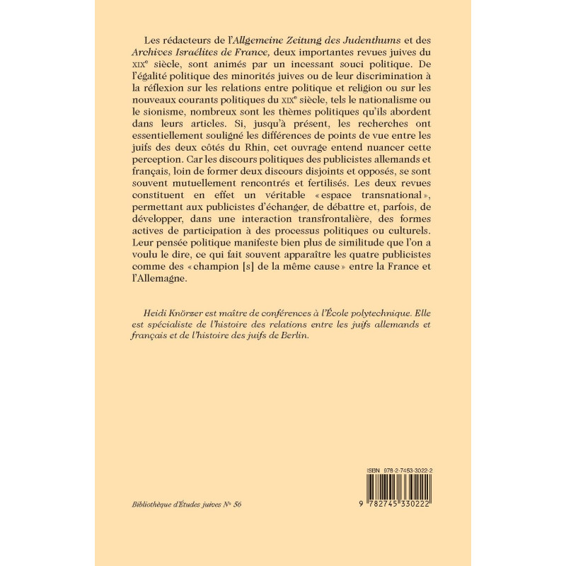 Les rédacteurs de l’Allgemeine Zeitung des Judenthums et des Archives Israélites de France, deux importantes revues juives du XIXe siècle, sont animés par un incessant souci politique. De l’égalité politique des minorités juives ou de leur discrimination à la réflexion sur les relations entre politique et religion ou sur les nouveaux courants politiques du XIXe siècle, tels le nationalisme ou le sionisme, nombreux sont les thèmes politiques qu’ils abordent dans leurs articles. Si, jusqu’à présent, les recherches ont essentiellement souligné les différences de points de vue entre les juifs des deux côtés du Rhin, cet ouvrage entend nuancer cette perception. Car les discours politiques des publicistes allemands et français, loin de former deux discours disjoints et opposés, se sont souvent mutuellement rencontrés et fertilisés. Les deux revues constituent en effet un véritable « espace transnational », permettant aux publicistes d’échanger, de débattre et, parfois, de développer, dans une interaction transfrontalière, des formes actives de participation à des processus politiques ou culturels. Leur pensée politique manifeste bien plus de similitude que l’on a voulu le dire, ce qui fait souvent apparaître les quatre publicistes comme des « champion [s] de la même cause » entre la France et l’Allemagne.