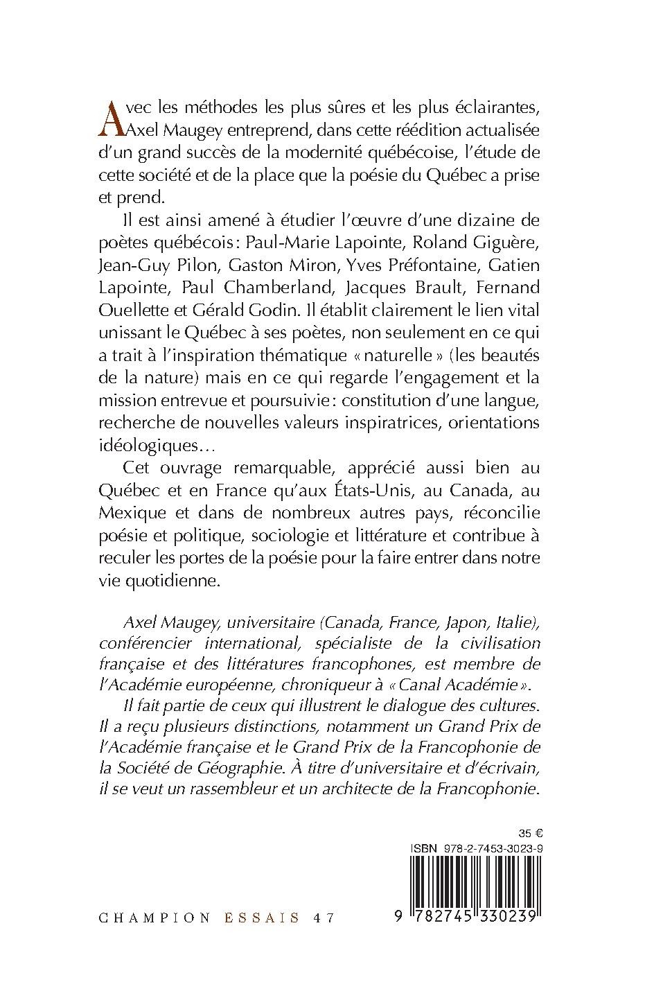 Avec les méthodes les plus sûres et les plus éclairantes, Axel Maugey entreprend, dans cette réédition actualisée d’un grand succès de la modernité québécoise, l’étude de cette société et de la place que la poésie du Québec a prise et prend.