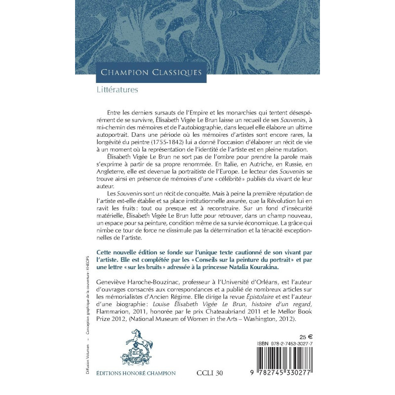 es Souvenirs sont un récit de conquête. Mais à peine la première réputation de l’artiste est-elle établie et sa place institutionnelle assurée, que la Révolution lui en ravit les fruits : tout ou presque est à reconstruire. Sur un fond d’insécurité matérielle, Élisabeth Vigée Le Brun lutte pour retrouver, dans un champ nouveau, un espace pour sa peinture, condition même de sa survie économique. La grâce qui nimbe ce tour de force ne dissimule pas la détermination et la ténacité exceptionnelles de l’artiste.