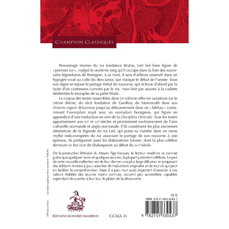 Le corpus des textes rassemblés dans ce volume offre six variations sur le même thème, du récit fondateur de Geoffroy de Monmouth dans son Historia regum Britanniae jusqu’au détournement dans un « fabliau » contaminant l’exemplum royal avec un exemplum bourgeois, qui figure en appendice d’une traduction en vers de la Disciplina clericalis. Tous les textes appartiennent aux XIIe et XIIIe siècles et proviennent exclusivement de l’aire culturelle normande et anglo-normande. S’ils constituent les plus anciennes attestations de la légende du roi Leïr, qui puise sa matière dans un vieux mythe indo-européen du roi associant le partage de son royaume à une épreuve, ils préfigurent aussi les élaborations futures, dont la plus célèbre demeure Le Roi Lear de Shakespeare au début du XVIIe siècle.