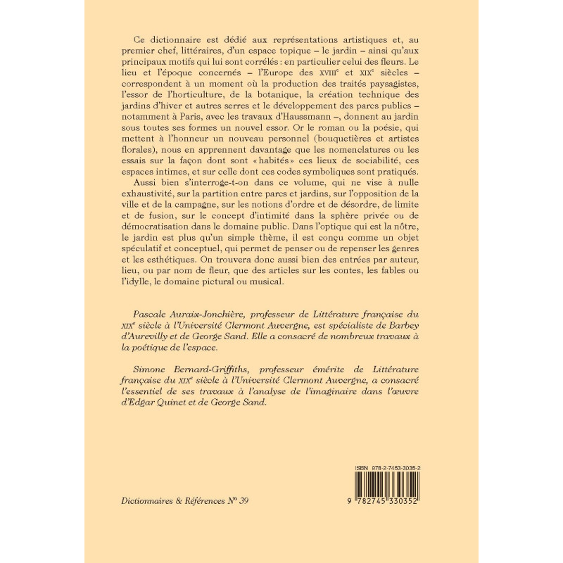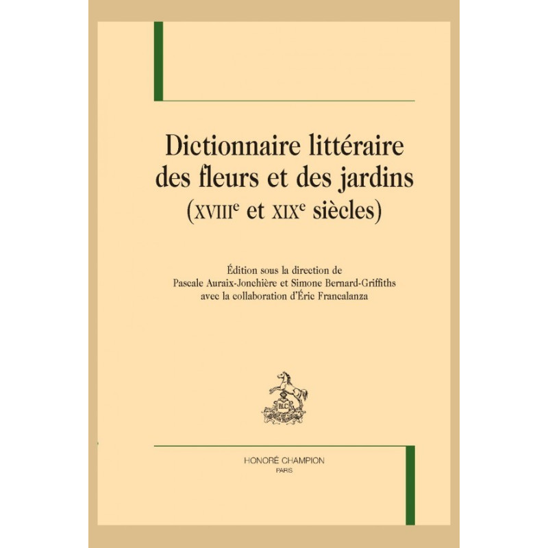 Ce dictionnaire est dédié aux représentations artistiques et, au premier chef, littéraires, d’un espace topique – le jardin – ainsi qu’aux principaux motifs qui lui sont corrélés : en particulier celui des fleurs. Le lieu et l’époque concernés – l’Europe des XVIIIe et XIXe siècles – correspondent à un moment où la production des traités paysagistes, l’essor de l’horticulture, de la botanique, la création technique des jardins d’hiver et autres serres et le développement des parcs publics – notamment à Paris, avec les travaux d’Haussmann –, donnent au jardin sous toutes ses formes un nouvel essor. Or le roman ou la poésie, qui mettent à l’honneur un nouveau personnel (bouquetières et artistes florales), nous en apprennent davantage que les nomenclatures ou les essais sur la façon dont sont « habités » ces lieux de sociabilité, ces espaces intimes, et sur celle dont ces codes symboliques sont pratiqués.