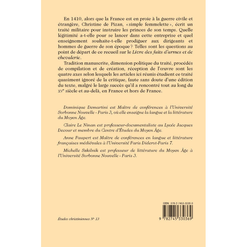 En 1410, alors que la France est en proie à la guerre civile et étrangère, Christine de Pizan, « simple femmelette », écrit un traité militaire pour instruire les princes de son temps. Quelle légitimité a-t-elle pour se lancer dans cette entreprise et quel enseignement souhaite-t-elle prodiguer aux dirigeants et hommes de guerre de son époque ? Telles sont les questions au point de départ de ce recueil sur le Livre des faits d’armes et de chevalerie.