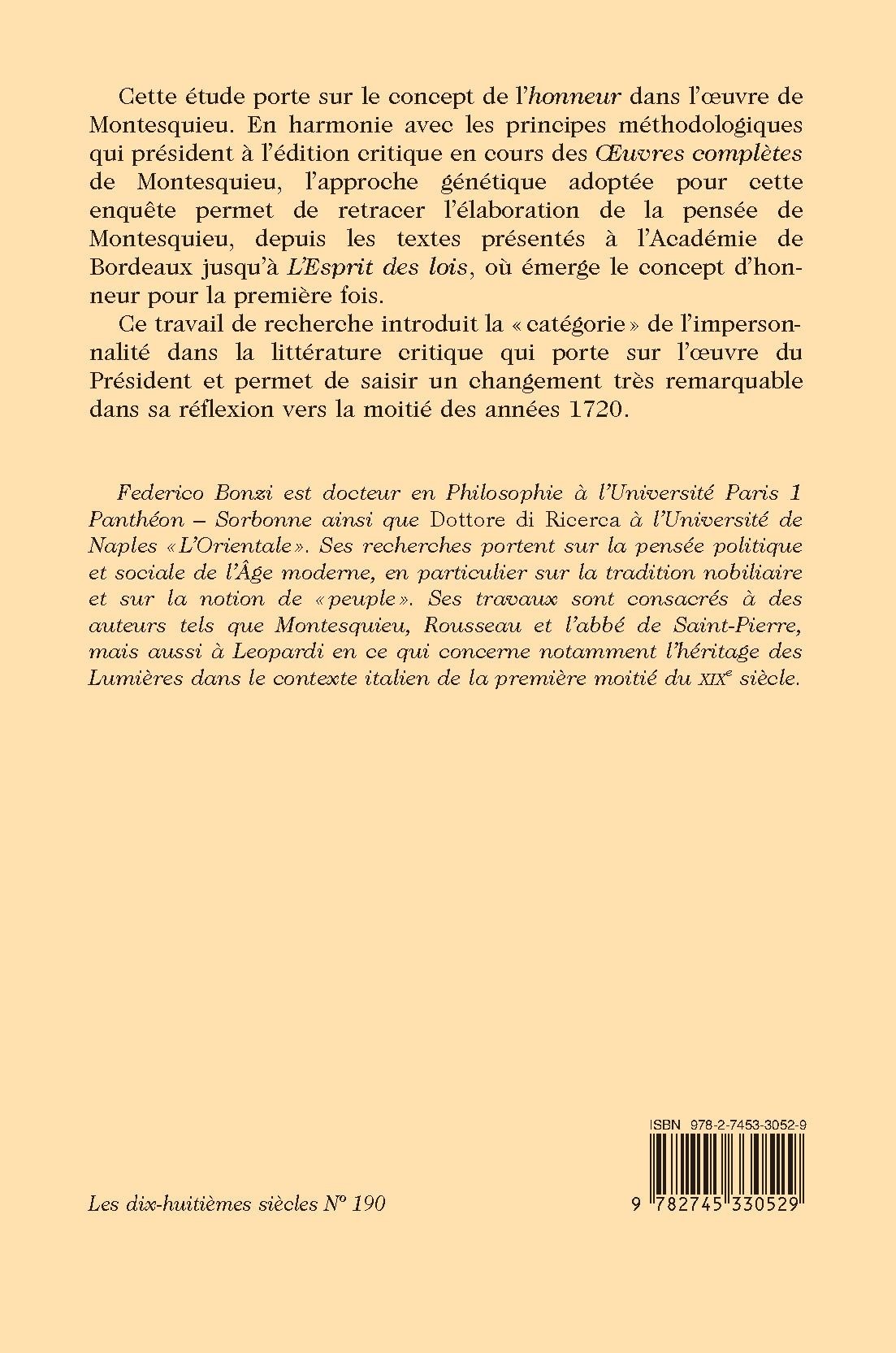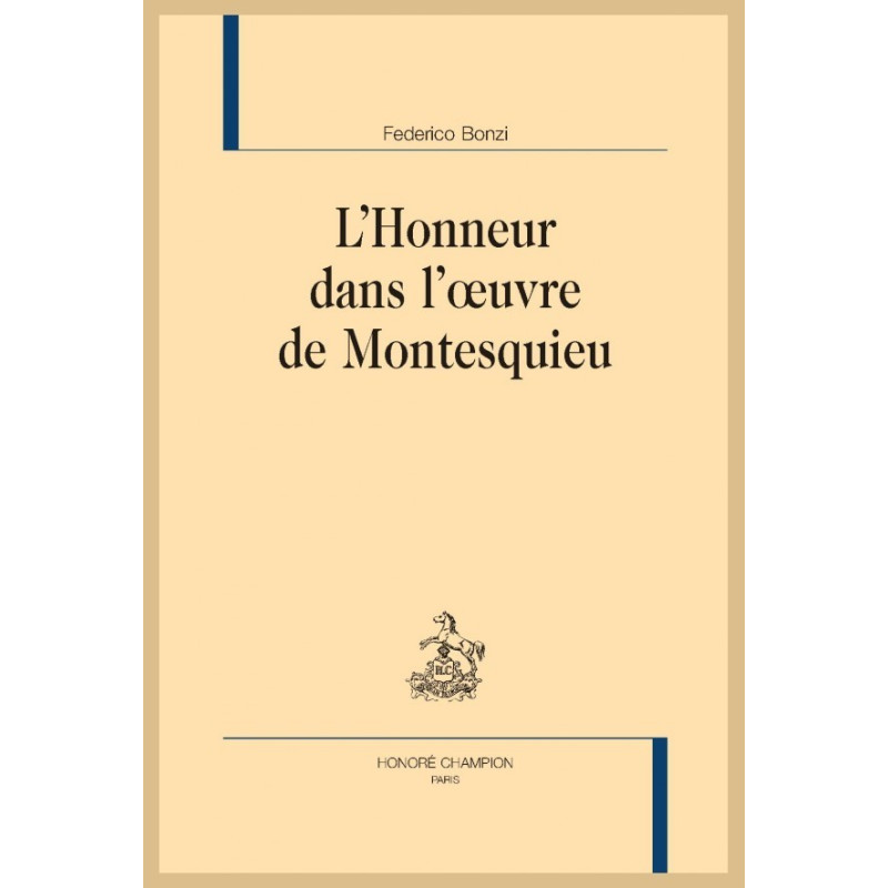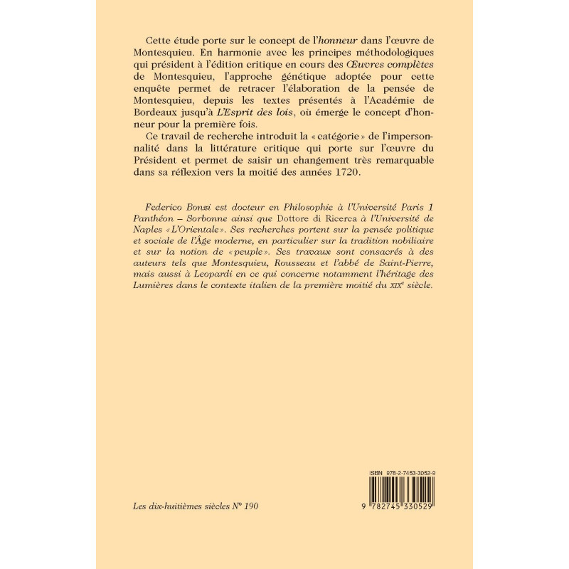 Cette étude porte sur le concept de l’honneur dans l’œuvre de Montesquieu. En harmonie avec les principes méthodologiques qui président à l’édition critique en cours des Œuvres complètes de Montesquieu, l’approche génétique adoptée pour cette enquête permet de retracer l’élaboration de la pensée de Montesquieu, depuis les textes présentés à l’Académie de Bordeaux jusqu’à L’Esprit des lois, où émerge le concept d’honneur pour la première fois. Ce travail de recherche introduit la « catégorie » de l’impersonnalité dans la littérature critique qui porte sur l’œuvre du Président et permet de saisir un changement très remarquable dans sa réflexion vers la moitié des années 1720.