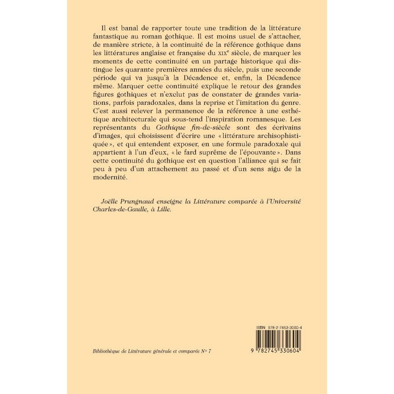 Il est banal de rapporter toute une tradition de la littérature fantastique au roman gothique. Il est moins usuel de s’attacher, de manière stricte, à la continuité de la référence gothique dans les littératures anglaise et française du XIXe siècle, de marquer les moments de cette continuité en un partage historique qui distingue les quarante premières années du siècle, puis une seconde période qui va jusqu’à la Décadence et, enfin, la Décadence même. Marquer cette continuité explique le retour des grandes figures gothiques et n’exclut pas de consta ter de grandes variations, parfois paradoxales, dans la reprise et l’imitation du genre. C’est aussi relever la permanence de la référence à une esthétique architecturale qui sous-tend l’inspiration romanesque. Les représentants du Gothique fin-de-siècle sont des écrivains d’images, qui choisissent d’écrire une « littérature archisophistiquée », et qui entendent exposer, en une formule paradoxale qui appartient à l’un d’eux, « le fard suprême de l’épouvante ». Dans cette continuité du gothique est en question l’alliance qui se fait peu à peu d’un attachement au passé et d’un sens aigu de la modernité.