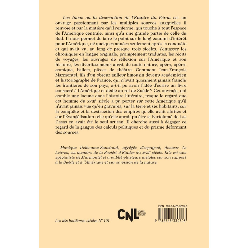 Les Incas ou la destruction de l’Empire du Pérou est un ouvrage passionnant par les multiples sources auxquelles il renvoie et par la matière qu’il renferme, qui touche à tout l’espace de l’Amérique centrale, ainsi qu’à une grande partie de celle du Sud. Il nous permet de faire le point sur le long courant d’intérêt pour l’Amérique, né quelques années seulement après la conquête et qui avait vu, au long de presque trois siècles, s’entasser les chroniques en langue originale, promptement traduites, les récits de voyages, les ouvrages de réflexion sur l’Amérique et son histoire, les divertissements aussi, de toute nature, opéra, opéra-comique, ballets, pièces de théâtre. Comment Jean-François Marmontel, fils d’un obscur tailleur limousin devenu académicien et historiographe de France, qui n’avait quasiment jamais franchi les frontières de son pays, a-t-il pu avoir l’idée d’écrire un livre consacré à l’Amérique et dédié au roi de Suède ? Cet ouvrage, qui comble une lacune dans l’histoire littéraire, traque le regard que cet homme du XVIIIe siècle a pu porter sur cette Amérique qu’il n’avait jamais vue qu’en gravures, sur la terre et ses habitants, sur la conquête et la destruction des empires qu’elle avait abrités et sur l’Évangélisation telle qu’elle aurait pu être si Bartolomé de Las Casas en avait été le seul artisan. Il cherche aussi à dégager ce regard de la gangue des calculs politiques et du prisme déformant des sources.