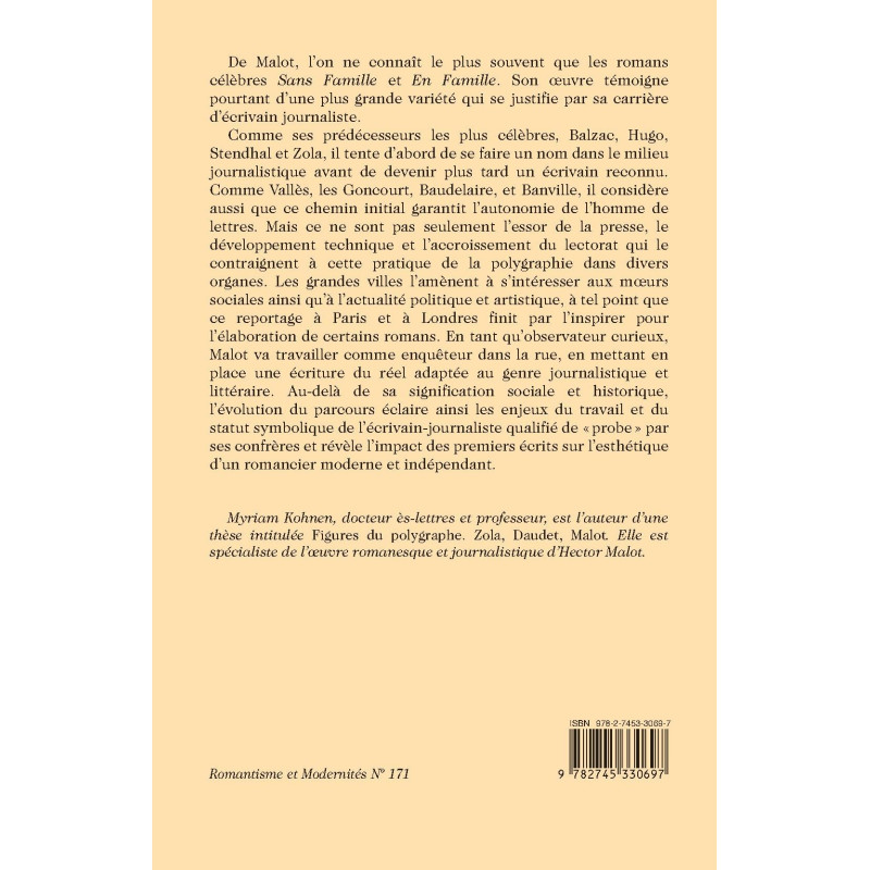 Comme ses prédécesseurs les plus célèbres, Balzac, Hugo, Stendhal et Zola, il tente d’abord de se faire un nom dans le milieu journalistique avant de devenir plus tard un écrivain reconnu. Comme Vallès, les Goncourt, Baudelaire, et Banville, il considère aussi que ce chemin initial garantit l’autonomie de l’homme de lettres. Mais ce ne sont pas seulement l’essor de la presse, le développement technique et l’accroissement du lectorat qui le contraignent à cette pratique de la polygraphie dans divers organes. Les grandes villes l’amènent à s’intéresser aux mœurs sociales ainsi qu’à l’actualité politique et artistique, à tel point que ce reportage à Paris et à Londres finit par l’inspirer pour l’élaboration de certains romans. En tant qu’observateur curieux, Malot va travailler comme enquêteur dans la rue, en mettant en place une écriture du réel adaptée au genre journalistique et littéraire. Au-delà de sa signification sociale et historique, l’évolution du parcours éclaire ainsi les enjeux du travail et du statut symbolique de l’écrivain-journaliste qualifié de « probe » par ses confrères et révèle l’impact des premiers écrits sur l’esthétique d’un romancier moderne et indépendant.