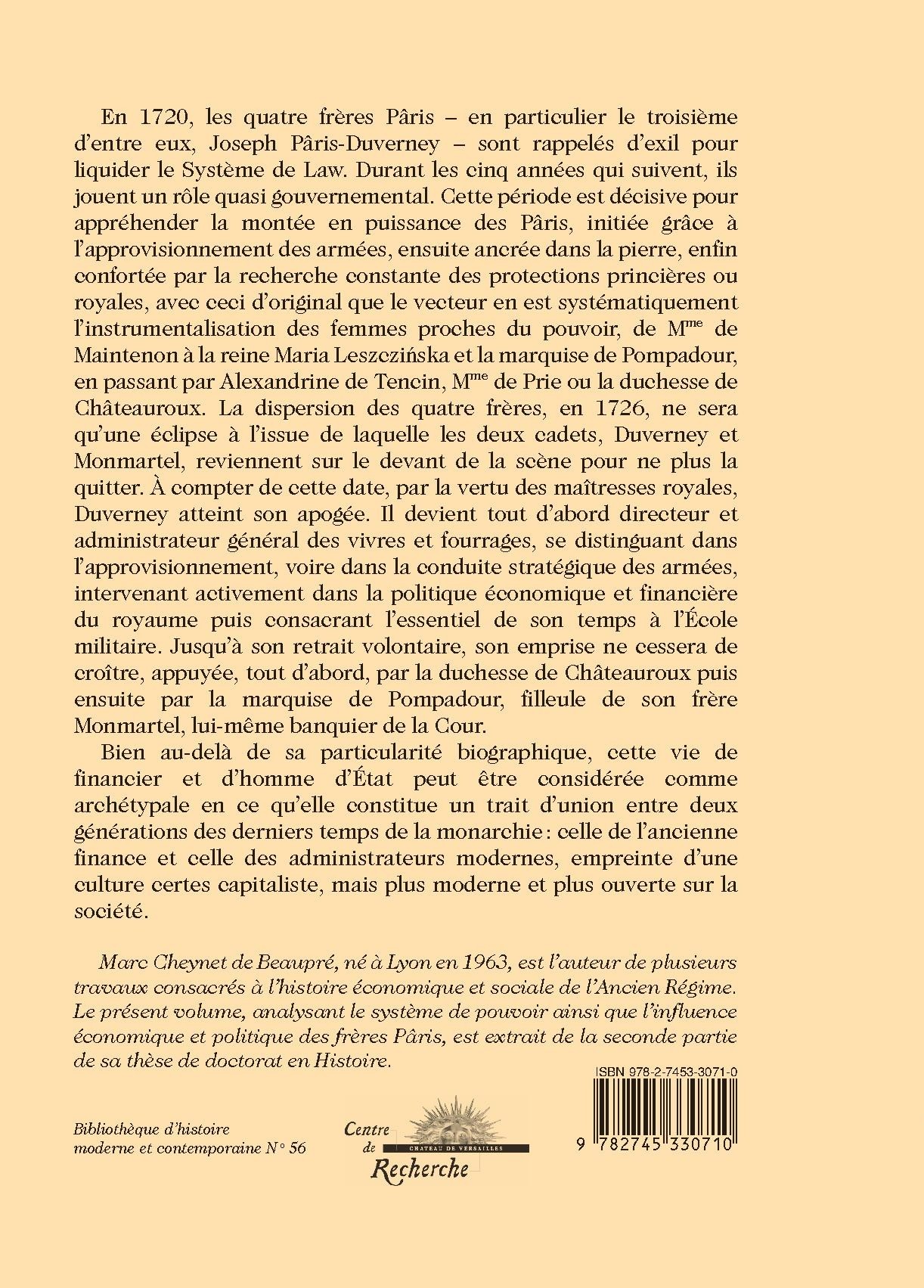 En 1720, les quatre frères Pâris – en particulier le troisième d’entre eux, Joseph Pâris-Duverney – sont rappelés d’exil pour liquider le Système de Law. Durant les cinq années qui suivent, ils jouent un rôle quasi gouvernemental. Cette période est décisive pour appréhender la montée en puissance des Pâris, initiée grâce à l’approvisionnement des armées, ensuite ancrée dans la pierre, enfin confortée par la recherche constante des protections princières ou royales, avec ceci d’original que le vecteur en est systématiquement l’instrumentalisation des femmes proches du pouvoir, de Mme de Maintenon à la reine Maria Leszczi?ska et la marquise de Pompadour, en passant par Alexandrine de Tencin, Mme de Prie ou la duchesse de Châteauroux. La dispersion des quatre frères, en 1726, ne sera qu’une éclipse à l’issue de laquelle les deux cadets, Duverney et Monmartel, reviennent sur le devant de la scène pour ne plus la quitter. À compter de cette date, par la vertu des maîtresses royales, Duverney atteint son apogée. Il devient tout d’abord directeur et administrateur général des vivres et fourrages, se distinguant dans l’approvisionnement, voire dans la conduite stratégique des armées, intervenant activement dans la politique économique et financière du royaume puis consacrant l’essentiel de son temps à l’École militaire. Jusqu’à son retrait volontaire, son emprise ne cessera de croître, appuyée, tout d’abord, par la duchesse de Châteauroux puis ensuite par la marquise de Pompadour, filleule de son frère Monmartel, lui-même banquier de la Cour. Bien au-delà de sa particularité biographique, cette vie de financier et d’homme d’État peut être considérée comme archétypale en ce qu’elle constitue un trait d’union entre deux générations des derniers temps de la monarchie : celle de l’ancienne finance et celle des administrateurs modernes, empreinte d’une culture certes capitaliste, mais plus moderne et plus ouverte sur la société.