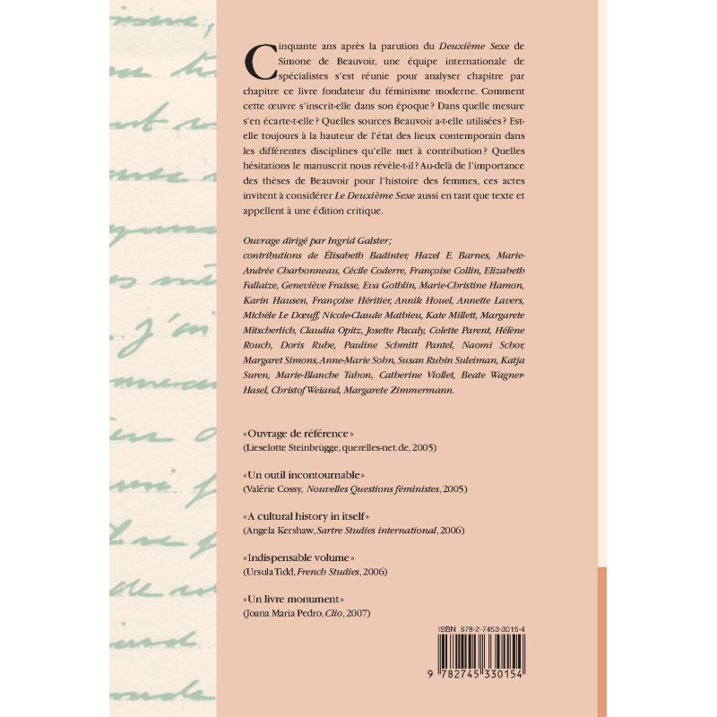 Cinquante ans après la parution du Deuxième Sexe de Simone de Beauvoir, une équipe internationale de spécialistes s’est réunie pour analyser chapitre par chapitre ce livre fondateur du féminisme moderne. Comment cette œuvre s’inscrit-elle dans son époque ? Dans quelle mesure s’en écarte-t-elle ? Quelles sources Beauvoir a-t-elle utilisées ? Estelle toujours à la hauteur de l’état des lieux contemporain dans les différentes disciplines qu’elle met à contribution ? Quelles hésitations le manuscrit nous révèle-t-il ? Au-delà de l’importance des thèses de Beauvoir pour l’histoire des femmes, ces actes invitent à considérer Le Deuxième Sexe aussi en tant que texte et appellent à une édition critique.