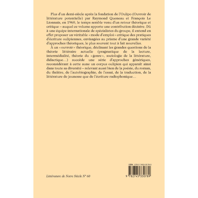 Plus d’un demi-siècle après la fondation de l’Oulipo (Ouvroir de littérature potentielle) par Raymond Queneau et François Le Lionnais, en 1960, le temps semble venu d’un retour théorique et critique – auquel ce volume apporte une contribution décisive. Dû à une équipe internationale de spécialistes du groupe, il entend en effet proposer un véritable «mode d’emploi » critique des pratiques d’écriture oulipiennes, envisagées au prisme d’une grande variété d’approches théoriques, le plus souvent tout à fait nouvelles.