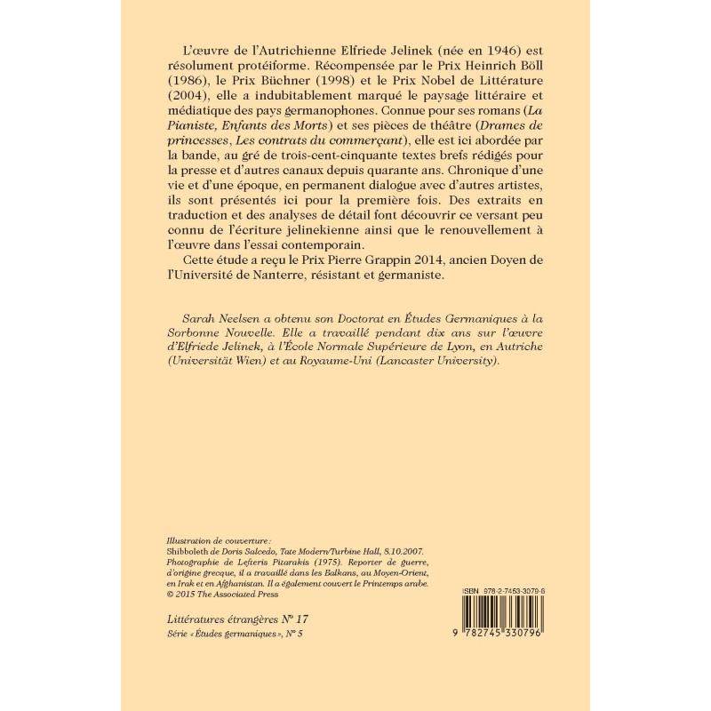 L’oeuvre de l’Autrichienne Elfriede Jelinek (née en 1946) est résolument protéiforme. Récompensée par le Prix Heinrich Böll (1986), le Prix Büchner (1998) et le Prix Nobel de Littérature (2004), elle a indubitablement marqué le paysage littéraire et médiatique des pays germanophones. Connue pour ses romans (La Pianiste, Enfants des Morts) et ses pièces de théâtre (Drames de princesses, Les contrats du commerçant), elle est ici abordée par la bande, au gré de trois-cent-cinquante textes brefs rédigés pour la presse et d’autres canaux depuis quarante ans. Chronique d’une vie et d’une époque, en permanent dialogue avec d’autres artistes, ils sont présentés ici pour la première fois. Des extraits en traduction et des analyses de détail font découvrir ce versant peu connu de l’écriture jelinekienne ainsi que le renouvellement à l’oeuvre dans l’essai contemporain.