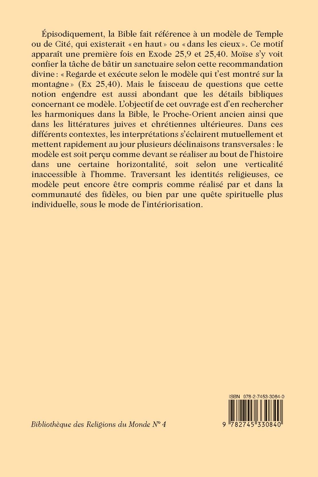 Épisodiquement, la Bible fait référence à un modèle de Temple ou de Cité, qui existerait « en haut » ou «dans les cieux ». Ce motif apparaît une première fois en Exode 25,9 et 25,40. Moïse s’y voit confier la tâche de bâtir un sanctuaire selon cette recommandation divine : «Regarde et exécute selon le modèle qui t’est montré sur la montagne» (Ex 25,40). Mais le faisceau de questions que cette notion engendre est aussi abondant que les détails bibliques concernant ce modèle. L’objectif de cet ouvrage est d’en rechercher les harmoniques dans la Bible, le Proche-Orient ancien ainsi que dans les littératures juives et chrétiennes ultérieures. Dans ces différents contextes, les interprétations s’éclairent mutuellement et mettent rapidement au jour plusieurs déclinaisons transversales : le modèle est soit perçu comme devant se réaliser au bout de l’histoire dans une certaine horizontalité, soit selon une verticalité inaccessible à l’homme. Traversant les identités religieuses, ce modèle peut encore être compris comme réalisé par et dans la communauté des fidèles, ou bien par une quête spirituelle plus individuelle, sous le mode de l’intériorisation