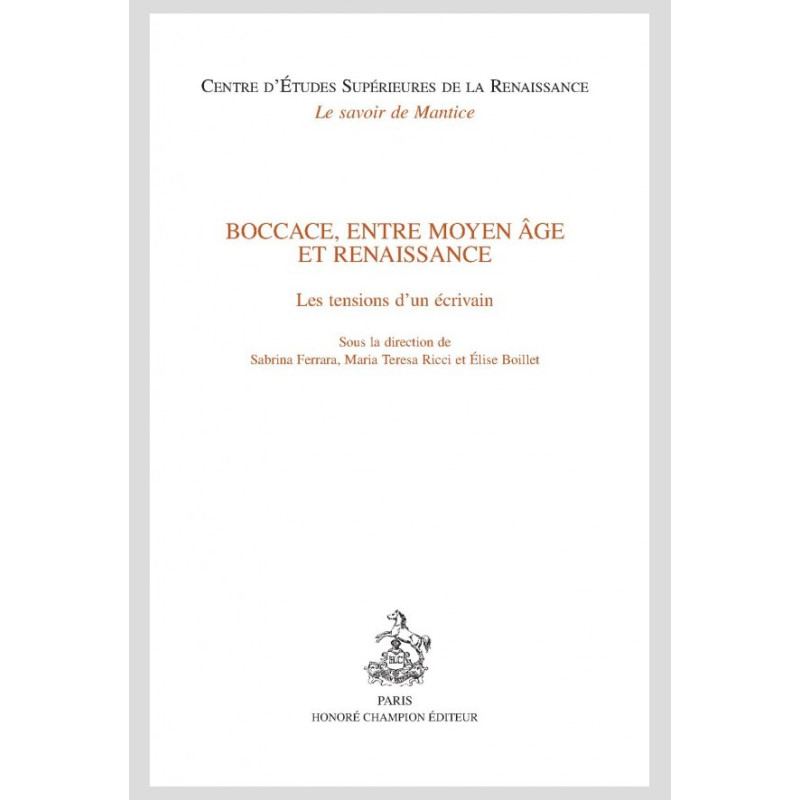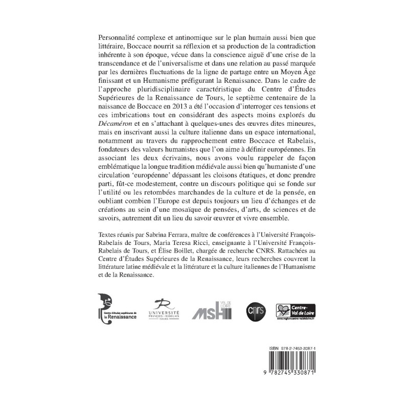 Personnalité complexe et antinomique sur le plan humain aussi bien que littéraire, Boccace nourrit sa réflexion et sa production de la contradiction inhérente à son époque, vécue dans la conscience aiguë d’une crise de la transcendance et de l’universalisme et dans une relation au passé marquée par les dernières fluctuations de la ligne de partage entre un Moyen Âge finissant et un Humanisme préfigurant la Renaissance. Dans le cadre de l’approche pluridisciplinaire caractéristique du Centre d’Études Supérieures de la Renaissance de Tours, le septième centenaire de la naissance de Boccace en 2013 a été l’occasion d’interroger ces tensions et ces imbrications tout en considérant des aspects moins explorés du Décaméron et en s’attachant à quelques-unes des œuvres dites mineures, mais en inscrivant aussi la culture italienne dans un espace international, notamment au travers du rapprochement entre Boccace et Rabelais, fondateurs des valeurs humanistes que l’on aime à définir européennes. En associant les deux écrivains, nous avons voulu rappeler de façon emblématique la longue tradition médiévale aussi bien qu’humaniste d’une circulation ‘européenne’ dépassant les cloisons étatiques, et donc prendre parti, fût-ce modestement, contre un discours politique qui se fonde sur l’utilité ou les retombées marchandes de la culture et de la pensée, en oubliant combien l’Europe est depuis toujours un lieu d’échanges et de créations au sein d’une mosaïque de pensées, d’arts, de sciences et de savoirs, autrement dit un lieu du savoir œuvrer et vivre ensemble.