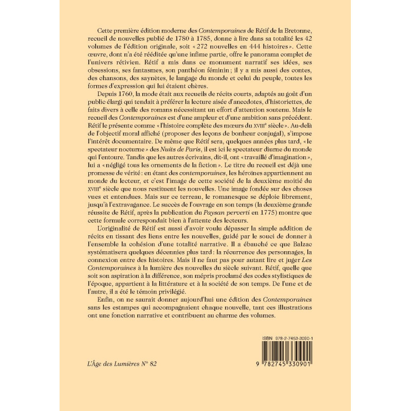 Cette première édition moderne des Contemporaines de Rétif de la Bretonne, recueil de nouvelles publié de 1780 à 1785, donne à lire dans sa totalité les 42 volumes de l’édition originale, soit « 272 nouvelles en 444 histoires ». Cette œuvre, dont n’a été rééditée qu’une infime partie, offre le panorama complet de l’univers rétivien. Rétif a mis dans ce monument narratif ses idées, ses obsessions, ses fantasmes, son panthéon féminin; il y a mis aussi des contes, des chansons, des saynètes, le langage du monde et celui du peuple, toutes les formes d’expression qui lui étaient chères.