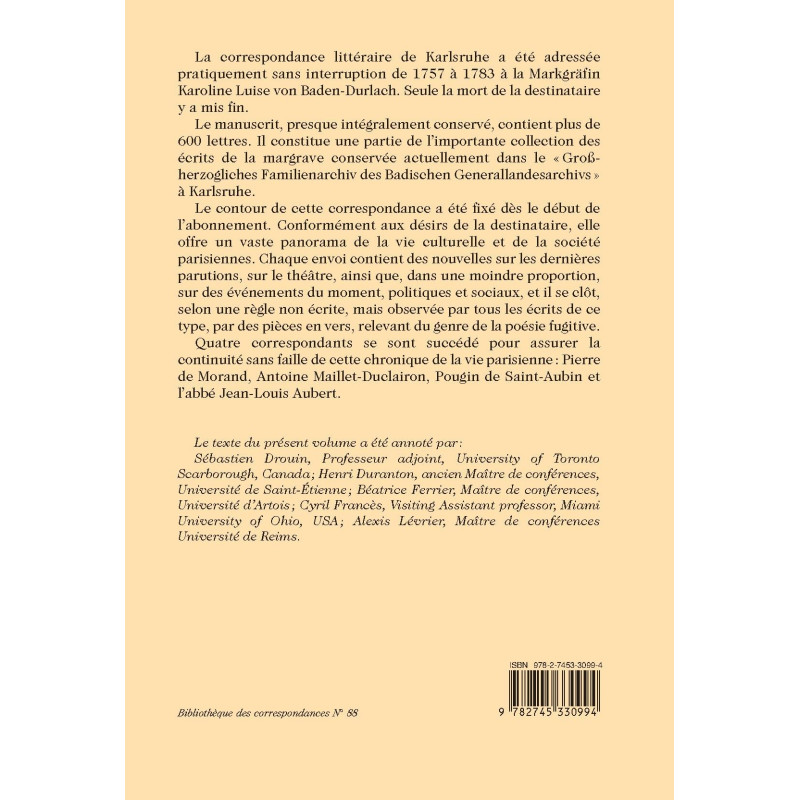 La correspondance littéraire de Karlsruhe a été adressée pratiquement sans interruption de 1757 à 1783 à la Markgräfin Karoline Luise von Baden-Durlach. Seule la mort de la destinataire y a mis fin.