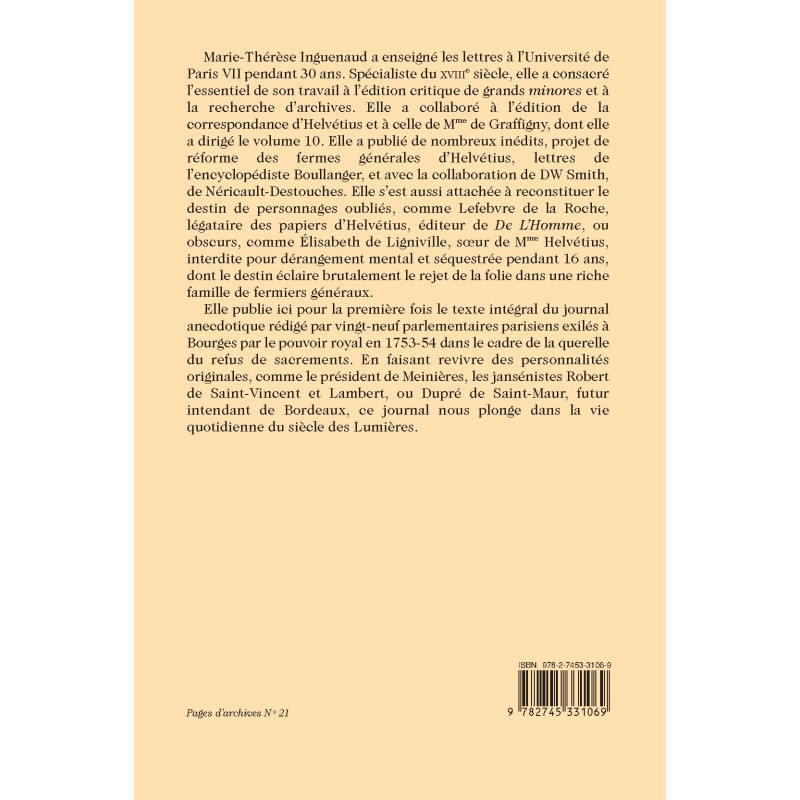 Elle publie ici pour la première fois le texte intégral du journal anecdotique rédigé par vingt-neuf parlementaires parisiens exilés à Bourges par le pouvoir royal en 1753-54 dans le cadre de la querelle du refus de sacrements. En faisant revivre des personnalités originales, comme le président de Meinières, les jansénistes Robert de Saint-Vincent et Lambert, ou Dupré de Saint-Maur, futur intendant de Bordeaux, ce journal nous plonge dans la vie quotidienne du siècle des Lumières.