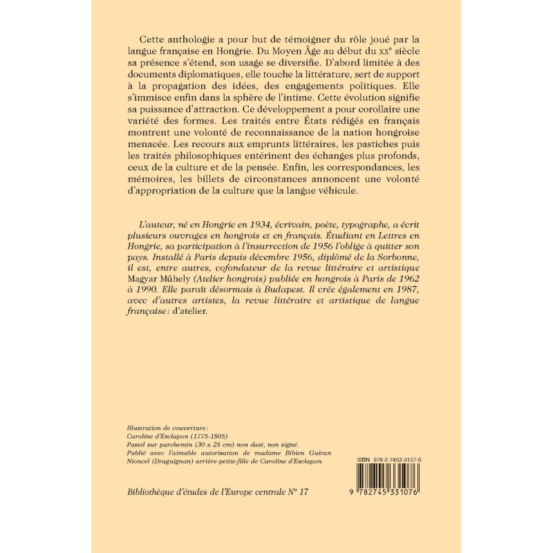 Cette anthologie a pour but de témoigner du rôle joué par la langue française en Hongrie. Du Moyen Âge au début du XXe siècle sa présence s’étend, son usage se diversifie. D’abord limitée à des documents diplomatiques, elle touche la littérature, sert de support à la propagation des idées, des engagements politiques. Elle s’immisce enfin dans la sphère de l’intime. Cette évolution signifie sa puissance d’attraction. Ce développement a pour corollaire une variété des formes. Les traités entre États rédigés en français montrent une volonté de reconnaissance de la nation hongroise menacée. Les recours aux emprunts littéraires, les pastiches puis les traités philosophiques entérinent des échanges plus profonds, ceux de la culture et de la pensée. Enfin, les correspondances, les mémoires, les billets de circonstances annoncent une volonté d’appropriation de la culture que la langue véhicule.