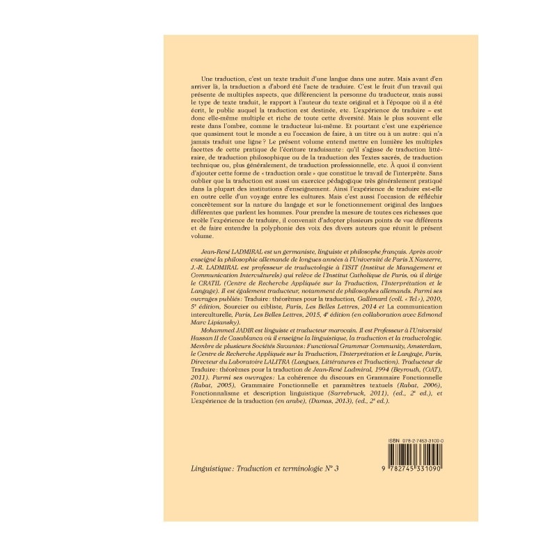 Jean-René LADMIRAL est un germaniste, linguiste et philosophe français. Après avoir enseigné la philosophie allemande de longues années à l’Université de Paris X Nanterre, J.-R. LADMIRAL est professeur de traductologie à l’ISIT (Institut de Management et Communication Interculturels) qui relève de l’Institut Catholique de Paris, où il dirige le CRATIL (Centre de Recherche Appliquée sur la Traduction, l’Interprétation et le Langage). Il est également traducteur, notamment de philosophes allemands. Parmi ses ouvrages publiés : Traduire : théorèmes pour la traduction, Gallimard (coll. «Tel »), 2010, 5e édition, Sourcier ou cibliste, Paris, Les Belles Lettres, 2014 et La communication interculturelle, Paris, Les Belles Lettres, 2015, 4e édition (en collaboration avec Edmond Marc Lipiansky).