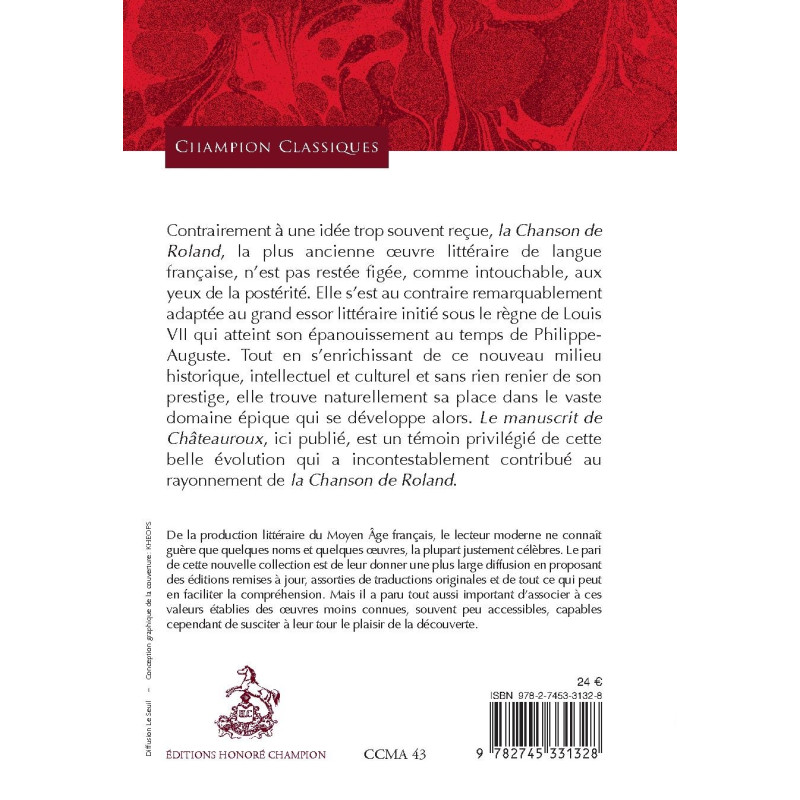 Contrairement à une idée trop souvent reçue, la Chanson de Roland, la plus ancienne oeuvre littéraire de langue française, n’est pas restée figée, comme intouchable, aux yeux de la postérité. Elle s’est au contraire remarquablement adaptée au grand essor littéraire initié sous le règne de Louis VII qui atteint son épanouissement au temps de Philippe- Auguste. Tout en s’enrichissant de ce nouveau milieu historique, intellectuel et culturel et sans rien renier de son prestige, elle trouve naturellement sa place dans le vaste domaine épique qui se développe alors. Le manuscrit de Châteauroux, ici publié, est un témoin privilégié de cette belle évolution qui a incontestablement contribué au rayonnement de la Chanson de Roland.