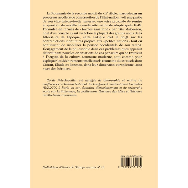 La Roumanie de la seconde moitié du XIXe siècle, marquée par un processus accéléré de construction de l’État-nation, voit une partie de son élite intellectuelle traverser une crise profonde de remise en question du modèle de modernité nationale adopté après 1848. Formulée en termes de « formes sans fond » par Titu Maiorescu, chef d’un cénacle ayant vu éclore la plupart des grands noms de la littérature de l’époque, cette critique met le doigt sur les contradictions identitaires propres aux « petites nations » tout en continuant de mobiliser la pensée occidentale de son temps. L’engagement de la philosophie dans ces problématiques apparaît déterminant pour les orientations de ces penseurs qui se trouvent à l’origine de la culture roumaine moderne, tout comme pour expliquer les déchirements intellectuels roumains du XXe siècle dont Cioran, Eliade ou Ionesco, dans leur dimension européenne, sont aussi des héritiers.