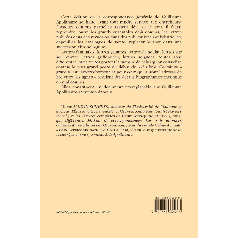D’une première lettre de Guillaume à sa mère, à l’âge de onze ans, jusqu’à sa dernière lettre à Reverdy, du 31 octobre 1918, quelques jours avant sa mort, ce corpus unique et chronologique de l’intégralité de la correspondance d’Apollinaire recouvre la vie entière du poète. Il est l’aboutissement de plus de cinquante ans de recherche de l’universitaire belge Victor Martin-Schmets.