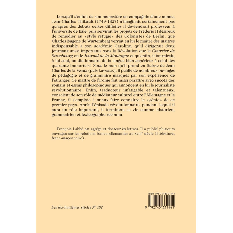 Lorsqu’il s’enfuit de son monastère en compagnie d’une nonne, Jean-Charles Thibault (1749-1827) n’imaginait certainement pas qu’après des débuts certes difficiles il deviendrait professeur à l’université de Bâle, puis servirait les projets de Frédéric II désireux de remédier au « style réfugié » des Colonistes de Berlin, que Charles Eugène de Wurtemberg verrait en lui le maître des maîtres indispensable à son académie Caroline, qu’il dirigerait deux journaux aussi importants sous la Révolution que le Courrier de Strasbourg ou le Journal de la Montagne et qu’enfin, il fournirait, à lui seul, un dictionnaire de la langue bien supérieur à celui des quarante immortels ! Sous le nom qu’il prend en Suisse de Jean Charles de la Veaux (puis Laveaux), il publie de nombreux ouvrages de pédagogie et de grammaire marqués par son expérience de l’étranger. Ce maître de l’ironie fait aussi paraître avec succès des romans et essais philosophiques qui annoncent en lui le journaliste révolutionnaire. Enfin, traducteur infatigable et talentueux, conscient de son rôle de médiateur culturel entre l’Allemagne et la France, il s’emploie à mieux faire connaître le « génie » de ce premier pays. Après l’épisode révolutionnaire, pendant lequel il aura un rôle important, il terminera sa vie comme historien, grammairien et lexicographe reconnu.