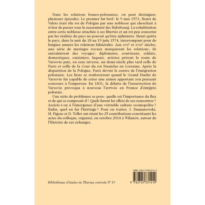 Dans les relations franco-polonaises, on peut distinguer, plusieurs épisodes. Le premier fut bref : le 9 mai 1573, Henri de Valois était élu roi de Pologne par une noblesse qui cherchait à éviter de passer sous la suzeraineté des Habsbourg. La cohabitation entre cette noblesse attachée à ses libertés et un roi peu concerné par les réalités du pays ne pouvait qu’être éphémère. Henri quitta le pays, dans la nuit du 18 au 19 juin 1574, interrompant pour de longues années les relations bilatérales. Aux XVIIe et XVIIIe siècles, une série de mariages royaux marquèrent les relations ; ils entraînèrent des voyages : diplomates, courtisans, soldats, domestiques, cuisiniers, laquais, artistes prirent la route de Varsovie puis, en sens inverse, un demi-siècle plus tard celle de Paris et celle de la Cour du roi Stanislas en Lorraine. Après la disparition de la Pologne, Paris devint le centre de l’émigration polonaise. Les liens se renforcèrent quand le Grand Duché de Varsovie fut capable de créer une armée apportant son puissant concours à l’empereur. En 1831, la défaite de l’insurrection de Varsovie provoqua à nouveau l’arrivée en France d’émigrés polonais.