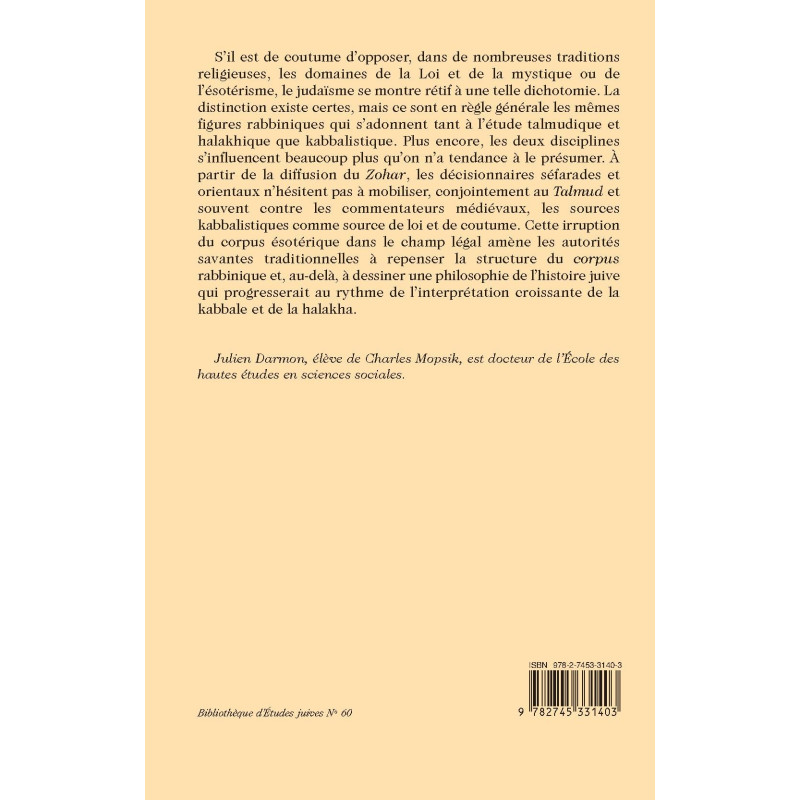 S’il est de coutume d’opposer, dans de nombreuses traditions religieuses, les domaines de la Loi et de la mystique ou de l’ésotérisme, le judaïsme se montre rétif à une telle dichotomie. La distinction existe certes, mais ce sont en règle générale les mêmes figures rabbiniques qui s’adonnent tant à l’étude talmudique et halakhique que kabbalistique. Plus encore, les deux disciplines s’influencent beaucoup plus qu’on n’a tendance à le présumer. À partir de la diffusion du Zohar, les décisionnaires séfarades et orientaux n’hésitent pas à mobiliser, conjointement au Talmud et souvent contre les commentateurs médiévaux, les sources kabbalistiques comme source de loi et de coutume. Cette irruption du corpus ésotérique dans le champ légal amène les autorités savantes traditionnelles à repenser la structure du corpus rabbinique et, au-delà, à dessiner une philosophie de l’histoire juive qui progresserait au rythme de l’interprétation croissante de la kabbale et de la halakha.