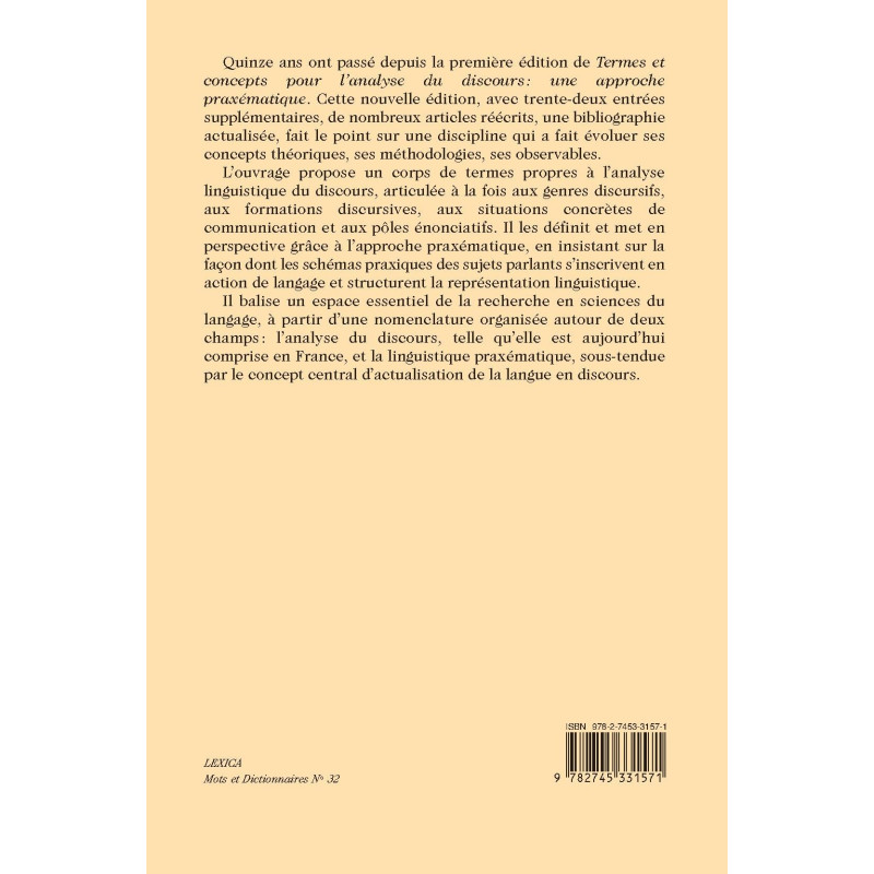Quinze ans ont passé depuis la première édition de Termes et concepts pour l’analyse du discours: une approche praxématique. Cette nouvelle édition, avec trente-deux entrées supplémentaires, de nombreux articles réécrits, une bibliographie actualisée, fait le point sur une discipline qui a fait évoluer ses concepts théoriques, ses méthodologies, ses observables.