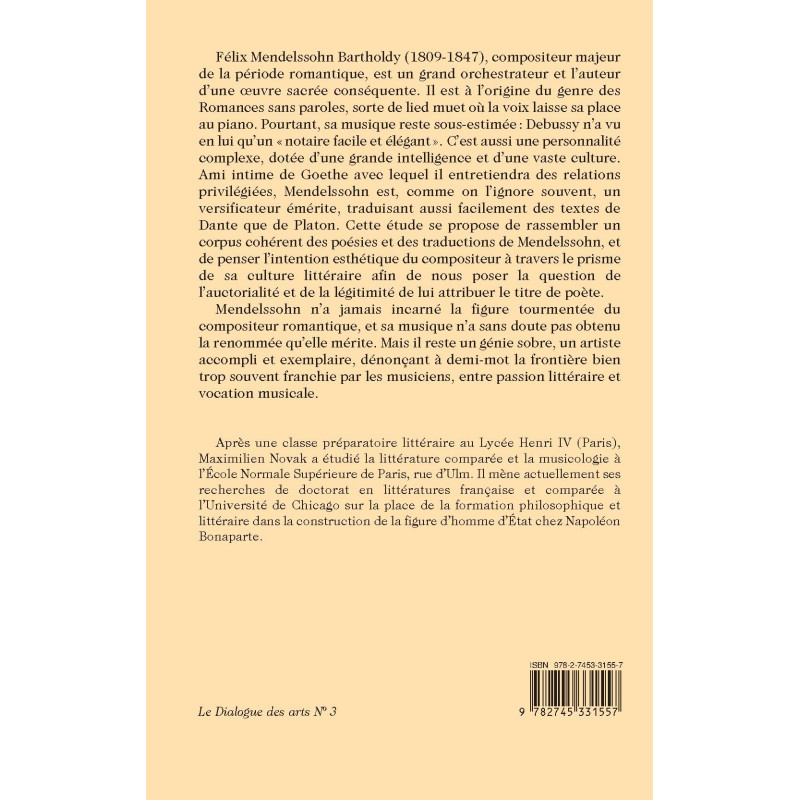 Félix Mendelssohn Bartholdy (1809-1847), compositeur majeur de la période romantique, est un grand orchestrateur et l’auteur d’une oeuvre sacrée conséquente. Il est à l’origine du genre des Romances sans paroles, sorte de lied muet où la voix laisse sa place au piano. Pourtant, sa musique reste sous-estimée : Debussy n’a vu en lui qu’un « notaire facile et élégant ». C’est aussi une personnalité complexe, dotée d’une grande intelligence et d’une vaste culture. Ami intime de Goethe avec lequel il entretiendra des relations privilégiées, Mendelssohn est, comme on l’ignore souvent, un versificateur émérite, traduisant aussi facilement des textes de Dante que de Platon. Cette étude se propose de rassembler un corpus cohérent des poésies et des traductions de Mendelssohn, et de penser l’intention esthétique du compositeur à travers le prisme de sa culture littéraire afin de nous poser la question de l’auctorialité et de la légitimité de lui attribuer le titre de poète.