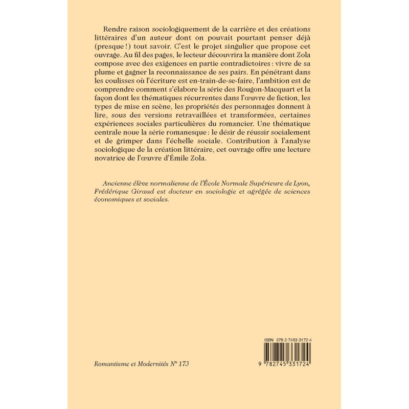 Rendre raison sociologiquement de la carrière et des créations littéraires d’un auteur dont on pouvait pourtant penser déjà (presque !) tout savoir. C’est le projet singulier que propose cet ouvrage. Au fil des pages, le lecteur découvrira la manière dont Zola compose avec des exigences en partie contradictoires : vivre de sa plume et gagner la reconnaissance de ses pairs. En pénétrant dans les coulisses où l’écriture est en-train-de-se-faire, l’ambition est de comprendre comment s’élabore la série des Rougon-Macquart et la façon dont les thématiques récurrentes dans l’oeuvre de fiction, les types de mise en scène, les propriétés des personnages donnent à lire, sous des versions retravaillées et transformées, certaines expériences sociales particulières du romancier. Une thématique centrale noue la série romanesque : le désir de réussir socialement et de grimper dans l’échelle sociale. Contribution à l’analyse sociologique de la création littéraire, cet ouvrage offre une lecture novatrice de l’oeuvre d’Émile Zola.