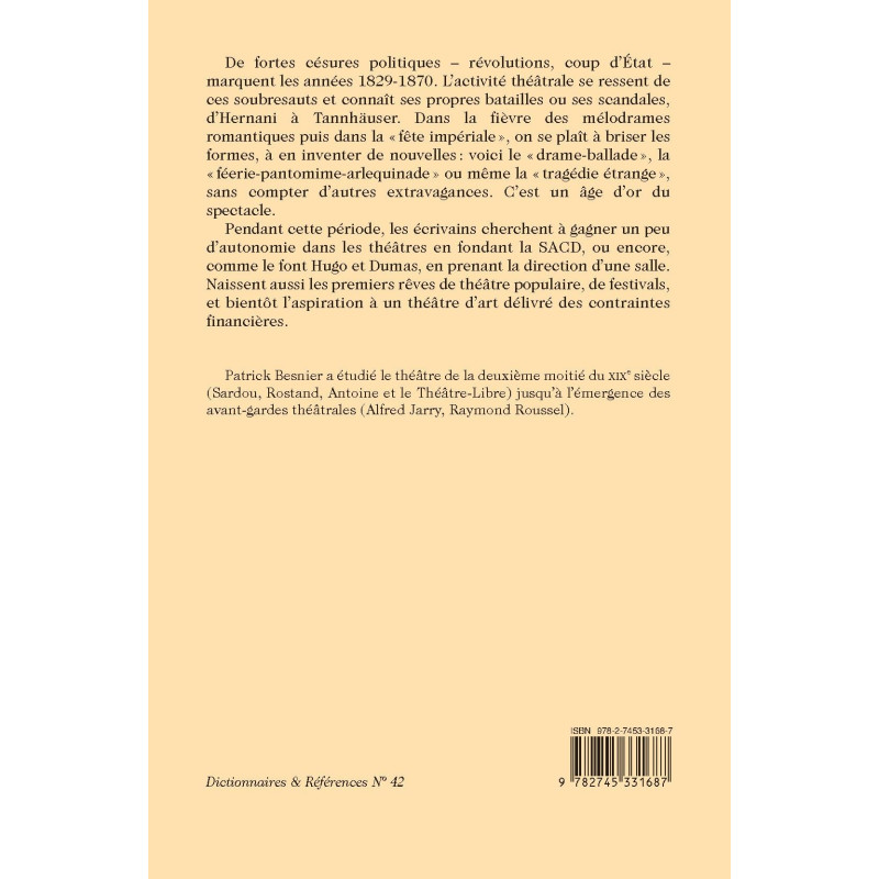 De fortes césures politiques – révolutions, coup d’État – marquent les années 1829-1870. L’activité théâtrale se ressent de ces soubresauts et connaît ses propres batailles ou ses scandales, d’Hernani à Tannhäuser. Dans la fièvre des mélodrames romantiques puis dans la « fête impériale », on se plaît à briser les formes, à en inventer de nouvelles : voici le « drame-ballade », la « féerie-pantomime-arlequinade » ou même la « tragédie étrange », sans compter d’autres extravagances. C’est un âge d’or du spectacle.
