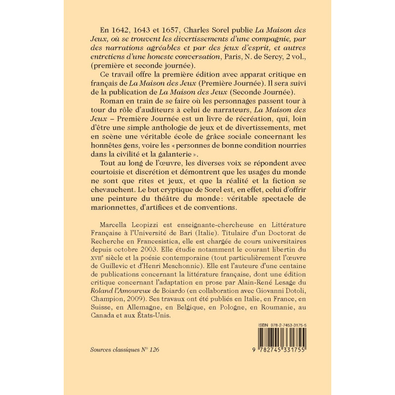 Ce travail offre la première édition avec apparat critique en français de La Maison des Jeux (Première Journée). Il sera suivi de la publication de La Maison des Jeux (Seconde Journée).