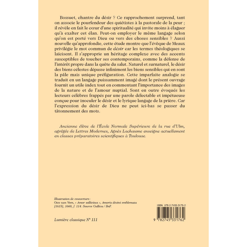 Bossuet, chantre du désir ? Ce rapprochement surprend, tant on associe le pourfendeur des quiétistes à la pastorale de la peur ; il révèle en fait le cœur d’une spiritualité qui invite moins à élaguer qu’à exalter cet élan. Peut-on employer le même langage selon qu’on est porté vers Dieu ou vers des choses sensibles ? Aussi nouvelle qu’approfondie, cette étude montre que l’évêque de Meaux privilégie le mot commun de désir car les termes théologiques se laïcisent. Il s’approprie un héritage complexe avec des accents susceptibles de toucher ses contemporains, comme la défense de l’intérêt propre dans la quête du salut. Naturel et surnaturel, le désir des biens célestes dépasse infiniment les biens sensibles qui en sont la pâle mais unique préfiguration. Cette imparfaite analogie se traduit en un langage puissamment imagé dont le présent ouvrage fournit un utile index tout en commentant l’importance des images de la nature et de l’amour nuptial. Sont en outre évoqués les lecteurs célèbres frappés par une parole délectable et impétueuse conçue pour inoculer le désir et le lyrique langage de la prière. Car l’expression du désir de Dieu ne peut ici-bas se passer du tâtonnement des mots.