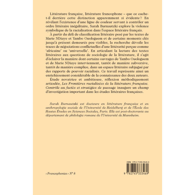 Étude novatrice et ambitieuse, réflexion méthodiquement articulée, Les Frontières racialisées de la littérature française. Contrôle au faciès et stratégies de passage inaugure un champ d’investigation important dans les études littéraires françaises.