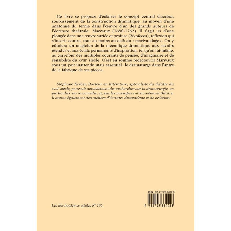 Ce livre se propose d’éclairer le concept central d’action, soubassement de la construction dramatique, au moyen d’une anatomie du terme dans l’oeuvre d’un des grands auteurs de l’écriture théâtrale : Marivaux (1688-1763). Il s’agit ici d’une plongée dans une oeuvre variée et profuse (36 pièces), réflexion qui s’inscrit contre, tout au moins au-delà du « marivaudage ». On y côtoiera un magicien de la mécanique dramatique aux savoirs étendus et aux éclats permanents d’inspiration, tel qu’en lui-même, au carrefour des multiples courants de pensée, d’imaginaire et de sensibilité du XVIIIe siècle. C’est en somme redécouvrir Marivaux sous un jour inattendu mais essentiel : le dramaturge dans l’antre de la fabrique de ses pièces.