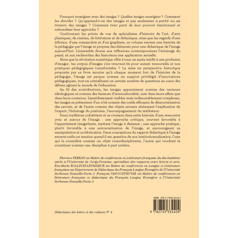 Confrontant les points de vue de spécialistes d’histoire de l’art, d’arts plastiques, de cinéma, de littérature et de didactique, ainsi que les regards d’une éditrice, d’une romancière et d’un graphiste, ce volume retrace une histoire de la pédagogie par l’image et propose des éléments pour une didactique de l’image aujourd’hui. L’ensemble donne aux réflexions contemporaines l’éclairage du passé, et aux recherches des historiens une application actuelle.