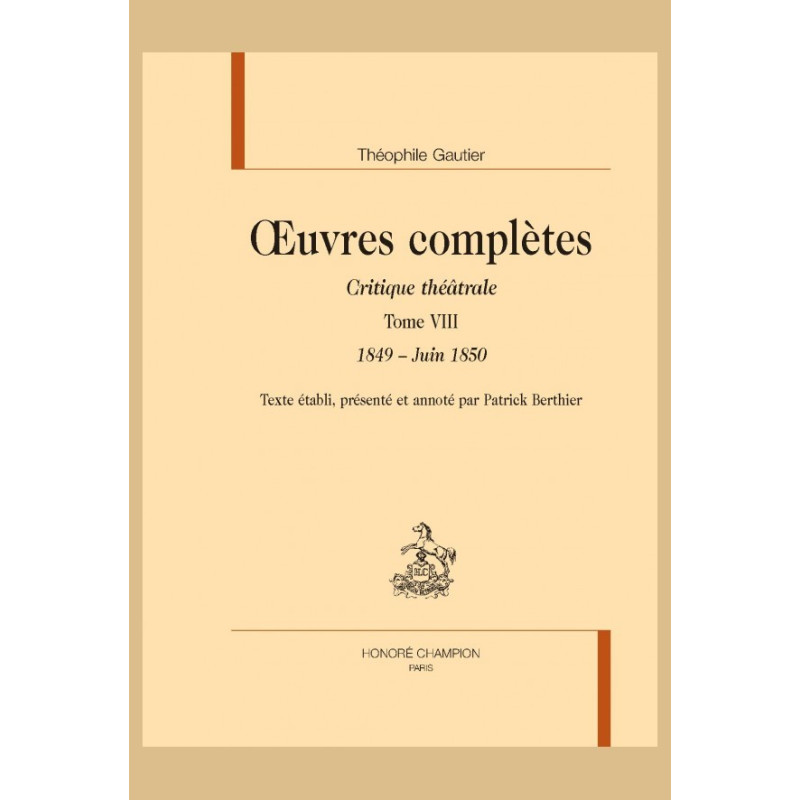 Comme pour les premiers tomes (I, 1835-1838, 2007 ; II, 1839-1840, 2008 ; III, 1841-1842, 2010 ; IV, 1843-août 1844, 2012; V, septembre 1844-1845, 2014 ; VI, 1846-juin 1847, 2015 ; VII, juillet 1847-1848, 2016), on lira ici la première édition en librairie du texte exact du feuilleton, établi avec soin et annoté en vue de donner accès dans le détail à ce témoignage exceptionnel sur l’histoire concrète du spectacle vivant au XIXe siècle.