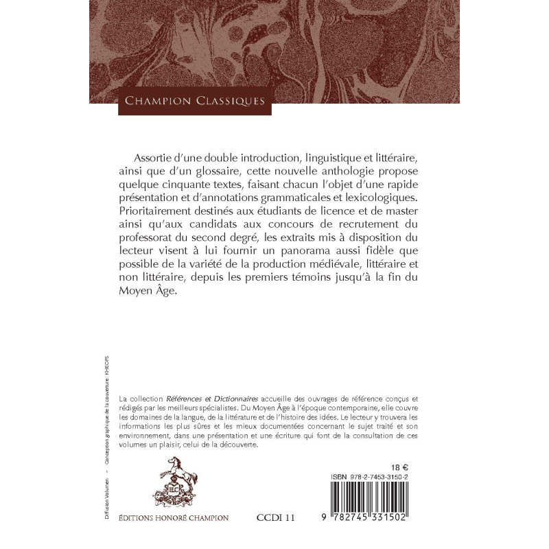 Assortie d’une double introduction, linguistique et littéraire, ainsi que d’un glossaire, cette nouvelle anthologie propose quelque cinquante textes, faisant chacun l’objet d’une rapide présentation et d’annotations grammaticales et lexicologiques. Prioritairement destinés aux étudiants de licence et de master ainsi qu’aux candidats aux concours de recrutement du professorat du second degré, les extraits mis à disposition du lecteur visent à lui fournir un panorama aussi fidèle que possible de la variété de la production médiévale, littéraire et non littéraire, depuis les premiers témoins jusqu’à la fin du Moyen Âge.