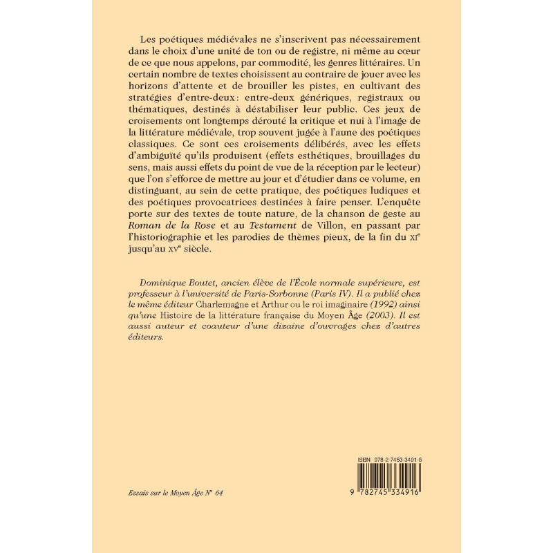 Les poétiques médiévales ne s’inscrivent pas nécessairement dans le choix d’une unité de ton ou de registre, ni même au cœur de ce que nous appelons, par commodité, les genres littéraires. Un certain nombre de textes choisissent au contraire de jouer avec les horizons d’attente et de brouiller les pistes, en cultivant des stratégies d’entre-deux : entre-deux génériques, registraux ou thématiques, destinés à déstabiliser leur public. Ces jeux de croisements ont longtemps dérouté la critique et nui à l’image de la littérature médiévale, trop souvent jugée à l’aune des poétiques classiques. Ce sont ces croisements délibérés, avec les effets d’ambiguïté qu’ils produisent (effets esthétiques, brouillages du sens, mais aussi effets du point de vue de la réception par le lecteur) que l’on s’efforce de mettre au jour et d’étudier dans ce volume, en distinguant, au sein de cette pratique, des poétiques ludiques et des poétiques provocatrices destinées à faire penser. L’enquête porte sur des textes de toute nature, de la chanson de geste au Roman de la Rose et au Testament de Villon, en passant par l’historiographie et les parodies de thèmes pieux, de la fin du XIe jusqu’au XVe siècle.