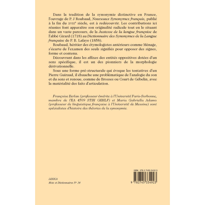 Dans la tradition de la synonymie distinctive en France, l’ouvrage de P. J Roubaud, Nouveaux Synonymes français, publié à la fin du XVIIIe siècle, est à redécouvrir. Les contributions ici réunies font apparaître son originalité radicale tout en le situant dans un vaste parcours, de la Justesse de la langue françoise de l’abbé Girard (1718) au Dictionnaire des Synonymes de la Langue française de P. B. Lafaye (1858).