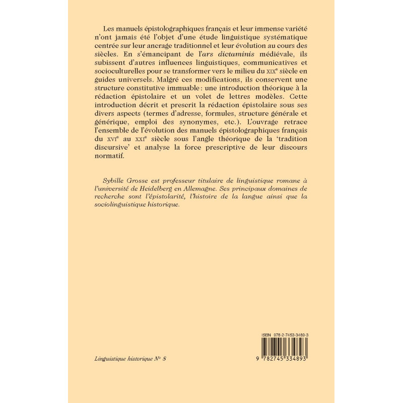 Les manuels épistolographiques français et leur immense variété n’ont jamais été l’objet d’une étude linguistique systématique centrée sur leur ancrage traditionnel et leur évolution au cours des siècles. En s’émancipant de l’ars dictaminis médiévale, ils subissent d’autres influences linguistiques, communicatives et socioculturelles pour se transformer vers le milieu du XIXe siècle en guides universels. Malgré ces modifications, ils conservent une structure constitutive immuable : une introduction théorique à la rédaction épistolaire et un volet de lettres modèles. Cette introduction décrit et prescrit la rédaction épistolaire sous ses divers aspects (termes d’adresse, formules, structure générale et générique, emploi des synonymes, etc.). L’ouvrage retrace l’ensemble de l’évolution des manuels épistolographiques français du XVIe au XXIe siècle sous l’angle théorique de la ‘tradition discursive’ et analyse la force prescriptive de leur discours normatif.