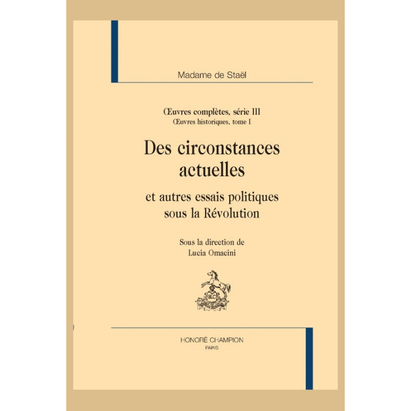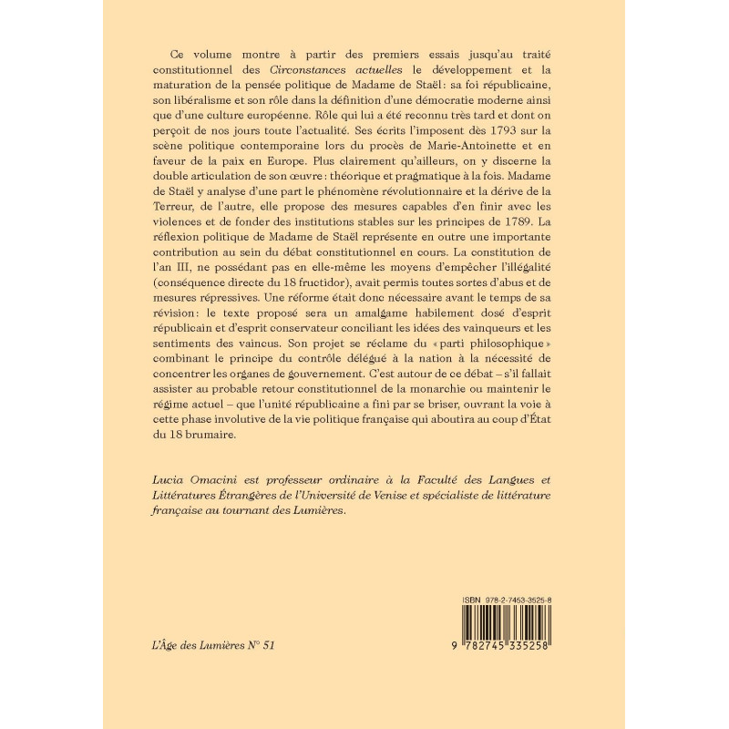 Ce volume montre à partir des premiers essais jusqu’au traité constitutionnel des Circonstances actuelles le développement et la maturation de la pensée politique de Madame de Staël : sa foi républicaine, son libéralisme et son rôle dans la définition d’une démocratie moderne ainsi que d’une culture européenne. Rôle qui lui a été reconnu très tard et dont on perçoit de nos jours toute l’actualité. Ses écrits l’imposent dès 1793 sur la scène politique contemporaine lors du procès de Marie-Antoinette et en faveur de la paix en Europe. Plus clairement qu’ailleurs, on y discerne la double articulation de son œuvre : théorique et pragmatique à la fois. Madame de Staël y analyse d’une part le phénomène révolutionnaire et la dérive de la Terreur, de l’autre, elle propose des mesures capables d’en finir avec les violences et de fonder des institutions stables sur les principes de 1789. La réflexion politique de Madame de Staël représente en outre une importante contribution au sein du débat constitutionnel en cours. La constitution de l’an III, ne possédant pas en elle-même les moyens d’empêcher l’illégalité (conséquence directe du 18 fructidor), avait permis toutes sortes d’abus et de mesures répressives. Une réforme était donc nécessaire avant le temps de sa révision : le texte proposé sera un amalgame habilement dosé d’esprit républicain et d’esprit conservateur conciliant les idées des vainqueurs et les sentiments des vaincus. Son projet se réclame du « parti philosophique » combinant le principe du contrôle délégué à la nation à la nécessité de concentrer les organes de gouvernement. C’est autour de ce débat – s’il fallait assister au probable retour constitutionnel de la monarchie ou maintenir le régime actuel – que l’unité républicaine a fini par se briser, ouvrant la voie à cette phase involutive de la vie politique française qui aboutira au coup d’État du 18 brumaire.