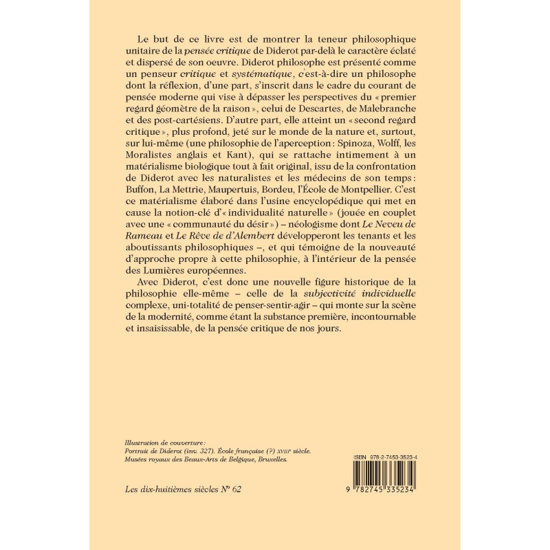 Le but de ce livre est de montrer la teneur philosophique unitaire de la pensée critique de Diderot par-delà le caractère éclaté et dispersé de son œuvre. Diderot philosophe est présenté comme un penseur critique et systématique, c’est-à-dire un philosophe dont la réflexion, d’une part, s’inscrit dans le cadre du courant de pensée moderne qui vise à dépasser les perspectives du « premier regard géomètre de la raison », celui de Descartes, de Malebranche et des post-cartésiens. D’autre part, elle atteint un « second regard critique », plus profond, jeté sur le monde de la nature et, surtout, sur lui-même (une philosophie de l’aperception : Spinoza, Wolff, les Moralistes anglais et Kant), qui se rattache intimement à un matérialisme biologique tout à fait original, issu de la confrontation de Diderot avec les naturalistes et les médecins de son temps : Buffon, La Mettrie, Maupertuis, Bordeu, l’École de Montpellier. C’est ce matérialisme élaboré dans l’usine encyclopédique qui met en cause la notion-clé d’« individualité naturelle » (jouée en couplet avec une « communauté du désir ») – néologisme dont Le Neveu de Rameau et Le Rêve de d’Alembert développeront les tenants et les aboutissants philosophiques –, et qui témoigne de la nouveauté d’approche propre à cette philosophie, à l’intérieur de la pensée des Lumières européennes.