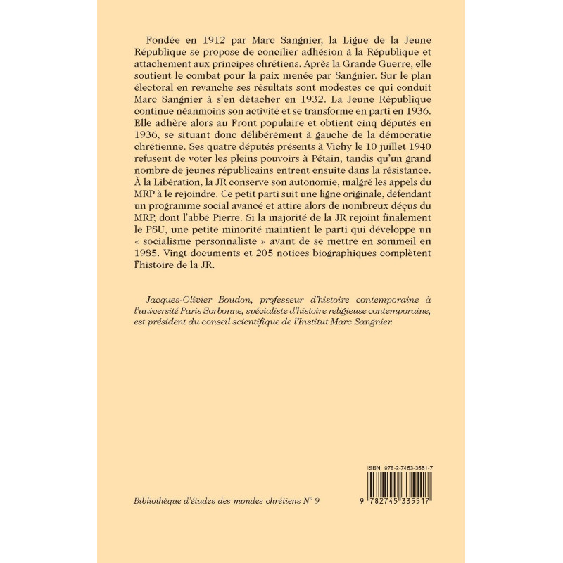 Fondée en 1912 par Marc Sangnier, la Ligue de la Jeune République se propose de concilier adhésion à la République et attachement aux principes chrétiens. Après la Grande Guerre, elle soutient le combat pour la paix menée par Sangnier. Sur le plan électoral en revanche ses résultats sont modestes ce qui conduit Marc Sangnier à s’en détacher en 1932. La Jeune République continue néanmoins son activité et se transforme en parti en 1936. Elle adhère alors au Front populaire et obtient cinq députés en 1936, se situant donc délibérément à gauche de la démocratie chrétienne. Ses quatre députés présents à Vichy le 10 juillet 1940 refusent de voter les pleins pouvoirs à Pétain, tandis qu’un grand nombre de jeunes républicains entrent ensuite dans la résistance. À la Libération, la JR conserve son autonomie, malgré les appels du MRP à le rejoindre. Ce petit parti suit une ligne originale, défendant un programme social avancé et attire alors de nombreux déçus du MRP, dont l’abbé Pierre. Si la majorité de la JR rejoint finalement le PSU, une petite minorité maintient le parti qui développe un « socialisme personnaliste » avant de se mettre en sommeil en 1985. Vingt documents et 205 notices biographiques complètent l’histoire de la JR.