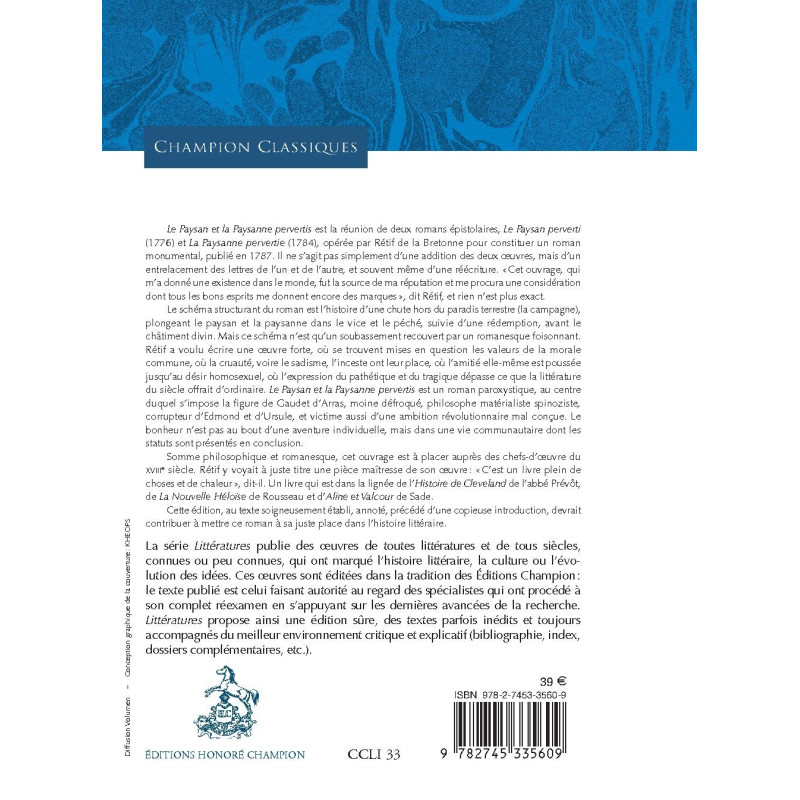 Le Paysan et la Paysanne pervertis est la réunion de deux romans épistolaires, Le Paysan perverti (1776) et La Paysanne pervertie (1784), opérée par Rétif de la Bretonne pour constituer un roman monumental, publié en 1787. Il ne s’agit pas simplement d’une addition des deux œuvres, mais d’un entrelacement des lettres de l’un et de l’autre, et souvent même d’une réécriture. « Cet ouvrage, qui m’a donné une existence dans le monde, fut la source de ma réputation et me procura une considération dont tous les bons esprits me donnent encore des marques », dit Rétif, et rien n’est plus exact. Le schéma structurant du roman est l’histoire d’une chute hors du paradis terrestre (la campagne), plongeant le paysan et la paysanne dans le vice et le péché, suivie d’une rédemption, avant le châtiment divin. Mais ce schéma n’est qu’un soubassement recouvert par un romanesque foisonnant. Rétif a voulu écrire une oeuvre forte, où se trouvent mises en question les valeurs de la morale commune, où la cruauté, voire le sadisme, l’inceste ont leur place, où l’amitié elle-même est poussée jusqu’au désir homosexuel, où l’expression du pathétique et du tragique dépasse ce que la littérature du siècle offrait d’ordinaire. Le Paysan et la Paysanne pervertis est un roman paroxystique, au centre duquel s’impose la figure de Gaudet d’Arras, moine défroqué, philosophe matérialiste spinoziste, corrupteur d’Edmond et d’Ursule, et victime aussi d’une ambition révolutionnaire mal conçue. Le bonheur n’est pas au bout d’une aventure individuelle, mais dans une vie communautaire dont les statuts sont présentés en conclusion. Somme philosophique et romanesque, cet ouvrage est à placer auprès des chefs-d'œuvre du XVIIIe siècle. Rétif y voyait à juste titre une pièce maîtresse de son oeuvre : «C’est un livre plein de choses et de chaleur», dit-il. Un livre qui est dans la lignée de l’Histoire de Cleveland de l’abbé Prévôt, de La Nouvelle Héloïse de Rousseau et d’Aline et Valcour de Sade. Cette édition, au texte soigneusement établi, annoté, précédé d’une copieuse introduction, devrait contribuer à mettre ce roman à sa juste place dans l’histoire littéraire.