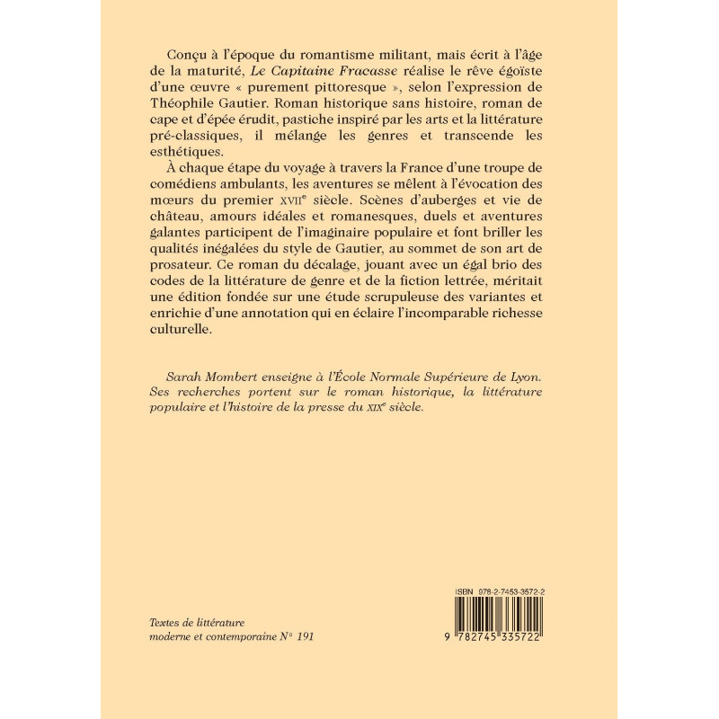Conçu à l’époque du romantisme militant, mais écrit à l’âge de la maturité, Le Capitaine Fracasse réalise le rêve égoïste d’une oeuvre « purement pittoresque », selon l’expression de Théophile Gautier. Roman historique sans histoire, roman de cape et d’épée érudit, pastiche inspiré par les arts et la littérature pré-classiques, il mélange les genres et transcende les esthétiques. À chaque étape du voyage à travers la France d’une troupe de comédiens ambulants, les aventures se mêlent à l’évocation des mœurs du premier XVIIe siècle. Scènes d’auberges et vie de château, amours idéales et romanesques, duels et aventures galantes participent de l’imaginaire populaire et font briller les qualités inégalées du style de Gautier, au sommet de son art de prosateur. Ce roman du décalage, jouant avec un égal brio des codes de la littérature de genre et de la fiction lettrée, méritait une édition fondée sur une étude scrupuleuse des variantes et enrichie d’une annotation qui en éclaire l’incomparable richesse culturelle.