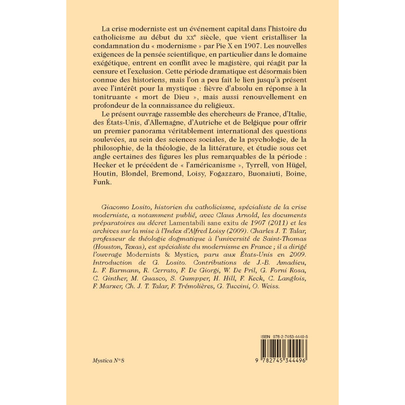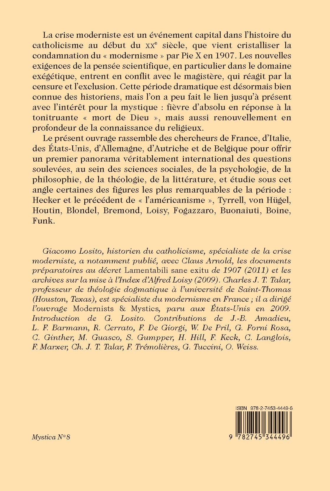 Giacomo Losito, historien du catholicisme, spécialiste de la crise moderniste, a notamment publié, avec Claus Arnold, les documents préparatoires au décret Lamentabili sane exitu de 1907 (2011) et les archives sur la mise à l’Index d’Alfred Loisy (2009). Charles J. T. Talar, professeur de théologie dogmatique à l’université de Saint-Thomas (Houston, Texas), est spécialiste du modernisme en France ; il a dirigé l’ouvrage Modernists & Mystics, paru aux États-Unis en 2009. Introduction de G. Losito. Contributions de J.-B. Amadieu, L. F. Barmann, R. Cerrato, F. De Giorgi, W. De Pril, G. Forni Rosa, C. Ginther, M. Guasco, S. Gumpper, H. Hill, F. Keck, C. Langlois, F. Marxer, Ch. J. T. Talar, F. Trémolières, G. Tuccini, O. Weiss.