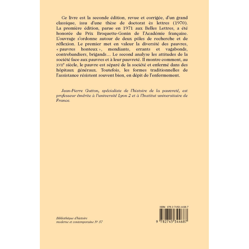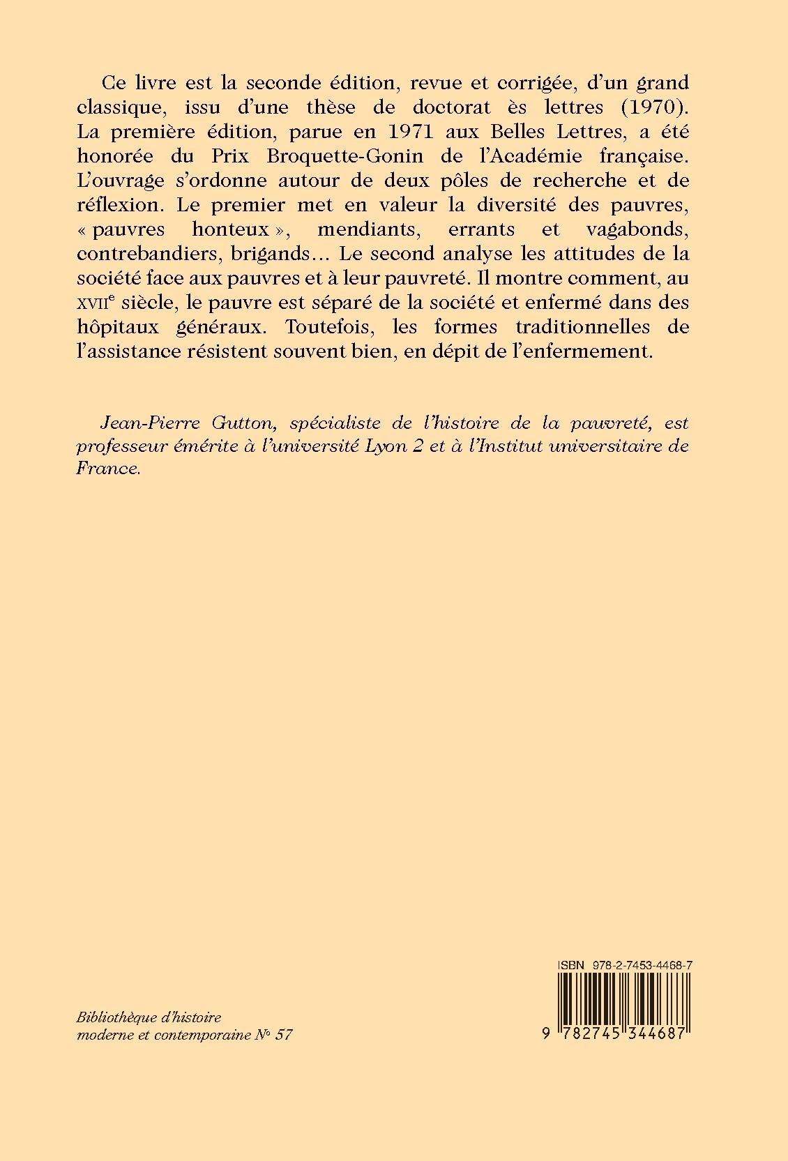 Ce livre est la seconde édition, revue et corrigée, d’un grand classique, issu d’une thèse de doctorat ès lettres (1970). La première édition, parue en 1971 aux Belles Lettres, a été honorée du Prix Broquette-Gonin de l’Académie française. L’ouvrage s’ordonne autour de deux pôles de recherche et de réflexion. Le premier met en valeur la diversité des pauvres, « pauvres honteux », mendiants, errants et vagabonds, contrebandiers, brigands… Le second analyse les attitudes de la société face aux pauvres et à leur pauvreté. Il montre comment, au XVIIe siècle, le pauvre est séparé de la société et enfermé dans des hôpitaux généraux. Toutefois, les formes traditionnelles de l’assistance résistent souvent bien, en dépit de l’enfermement.
